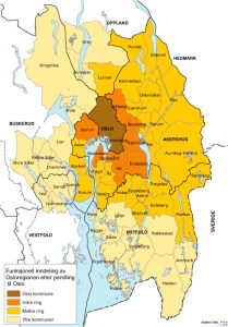 Kartet viser «ringer» rundt Oslo (ulike farger) – basert på nivået for pendling til Oslo fra de andre kommunene (indre og ytre ring og ytre kommuner). Kommunene i indre ring har ca 40 prosent eller mer pendling til Oslo, mens kommunene i ytre ring ligger fra ca 10 – 40 prosent. Bykommuner som Moss og Drammen har sine egne pendlingsomland, og er derfor lagt til det ytre området, selv om de har noe høyere pendlingsandel til Oslo enn 10 prosent. Med på kartet er de 56 kommunene i samarbeidsalliansen Osloregionen, som består av Oslo kommune, fylkeskommunene Akershus og Østfold, samtlige kommuner i de to fylkene, og kommuner i Buskerud, Vestfold og Oppland. Dette er den funksjonelle Osloregionen. Store deler av denne utgjør den regionen som vi kaller Viken.