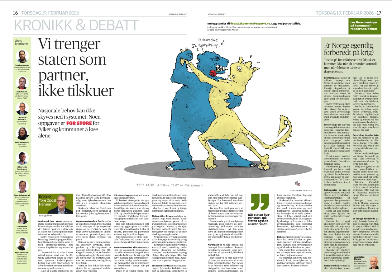 Norge kan ikke nå nasjonale mål med lokale budsjetter alene. Likevel forventes kommuner og fylkeskommuner å levere mer, samtidig som staten for ofte holder igjen på finansiering og infrastruktur. Det svekker gjennomføringskraften der politikken faktisk møter folk. Resultatet er pressede tjenester, mindre handlingsrom og et lokaldemokrati under stadig hardere press. Dette er en politisk systemsvikt, ikke et lokalt gjennomføringsproblem. Vi trenger en stat som tar medansvar for investeringer, drift og utvikling. Det var det jeg skrev om i Kommunal Rapport 19. februar og som du kan lese under.